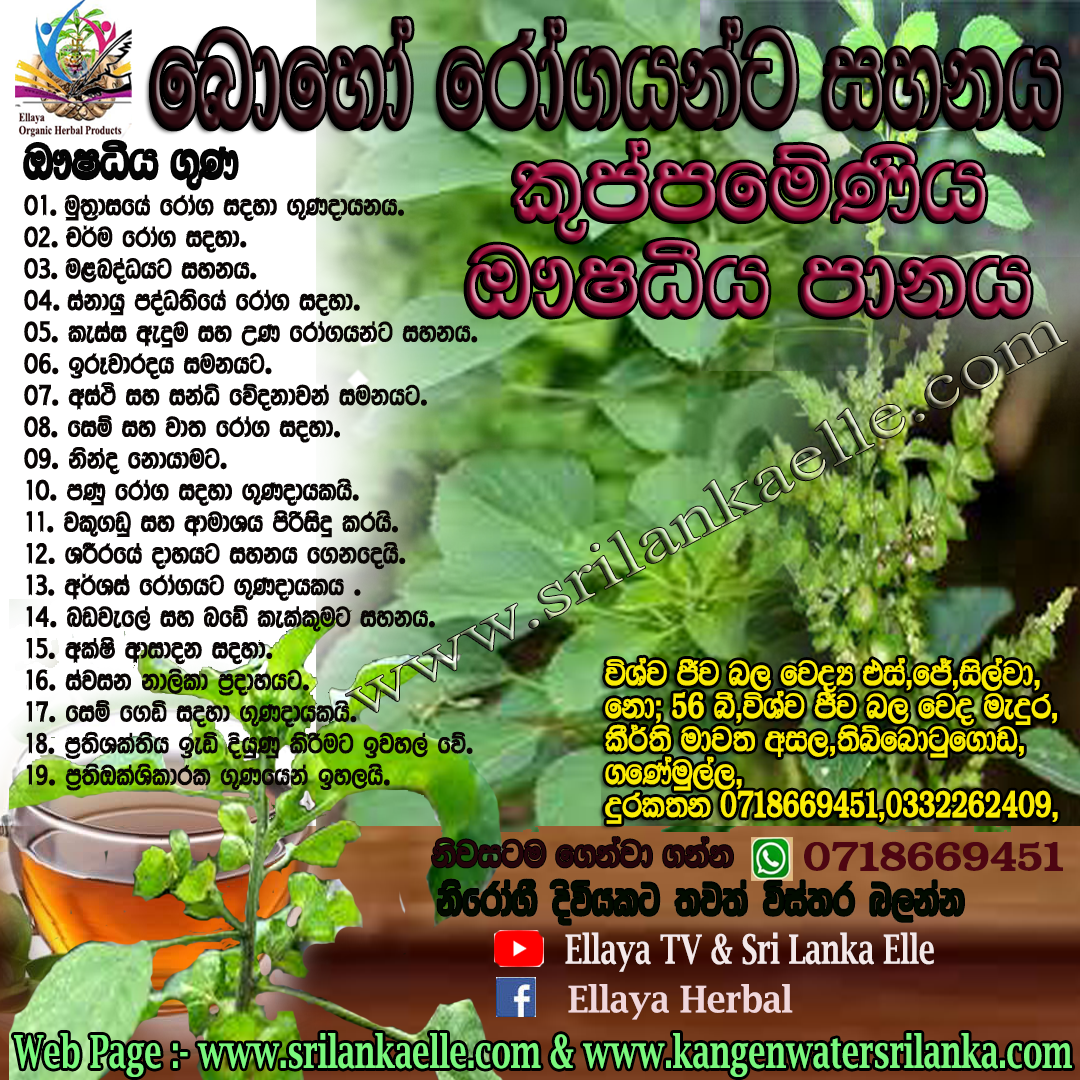 අපි ඔබට ශාක සාර හදුන්වා දෙන්නේ ඔබ පමණක් නොව ඔබගේ දරුවන් තම පරපුර මෙන්ම අසල්වැසියන් ලක්වාසීන් බරපතල රෝගයන්ගෙන් මුදවාලීමටත් නිරෝගී ජනතාවක් බිහිකර ගනිමින් රට සංවර්දනය වෙනුවෙන් හැකි පමනින් දායකත්වයක් ලබාදීමේ මුලික අරමුණ පෙරදැරි කරගෙනමය.We are introducing herbal products to you, not only for you, but also for your children and their descendants, as well as for the neighbors and the people of Laksha to be saved from serious diseases, keeping in mind the primary goal of making a contribution to the country's development by creating a healthy people.